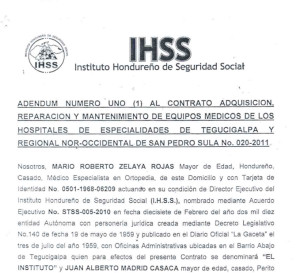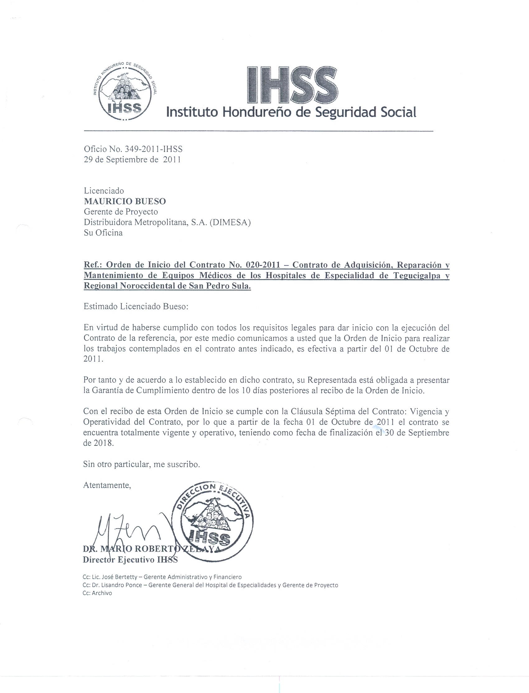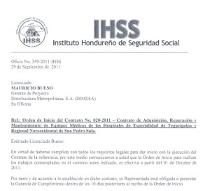 In 2011, Dimesa signed a contract for comprehensive services with Instituto Hondureño de Seguridad Social (IHSS), through a competitive international bidding process for the acquisition, repair, maintenance, financing, technical support, and warranty service of 908 medical equipment for various areas of care within the IHSS.