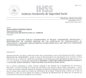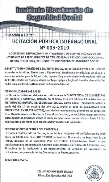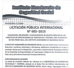 DIMESA bided during the Competitive International Bidding process No. 005-2010 of the IHSS Biomedical Project along with 17 other local and foreign companies. The biding was open to the general public or for any Honduran or global company since the terms were published in the most popular newspapers in the country as well as on the State Procurement Office’s (ONCAE) website.
